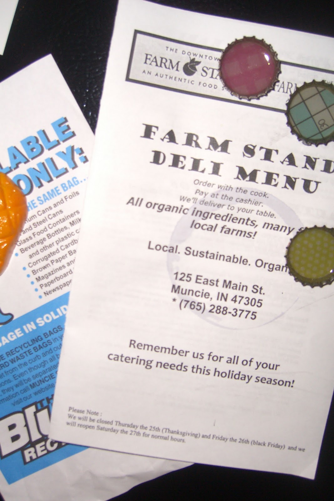 And the menu for the local organic market/restaurant located around the corner as well as a guideline for all things recyclable in Muncie. I haven't actually eaten at this market, but have very good intentions of becoming a regular customer. Someday. The bottle cap magnets were made by my friend Jess, by the way.